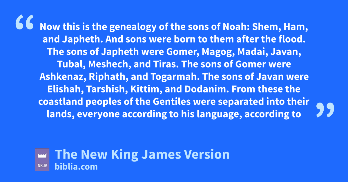 2 bThe sons of Japheth were Gomer, Magog, Madai, Javan, Tubal, Meshech, and Tiras. 3 The sons of Gomer were Ashkenaz, 1Riphath, and Togarmah. 4 The sons of Javan were Elishah, Tarshish, Kittim, and 2Dodanim. 5 From these cthe coastland peoples of the Gentiles were separated into their lands, everyone according to his language, according to their families, into their nations.