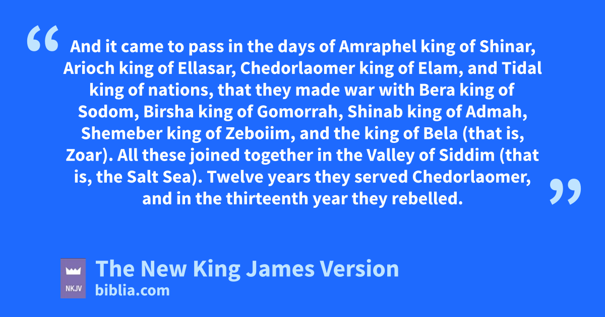 14 And it came to pass in the days of Amraphel king aof Shinar, Arioch king of Ellasar, Chedorlaomer king of bElam, and Tidal king of 1nations, 2 that they made war with Bera king of Sodom, Birsha king of Gomorrah, Shinab king of cAdmah, Shemeber king of Zeboiim, and the king of Bela (that is, dZoar). 3 All these joined together in the Valley of Siddim e(that is, the Salt Sea). 4 Twelve years fthey served Chedorlaomer, and in the thirteenth year they rebelled.