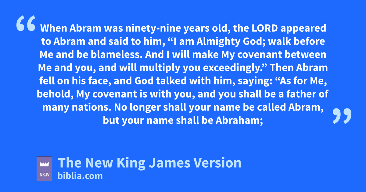 17 When Abram was ninety-nine years old, the Lord aappeared to Abram and said to him, b“I am 1Almighty God; cwalk before Me and be dblameless. 2 And I will make My ecovenant between Me and you, and fwill multiply you exceedingly.” 3 Then Abram fell on his face, and God talked with him, saying: 4 “As for Me, behold, My covenant is with you, and you shall be ga father of 2many nations. 5 No longer shall hyour name be called 3Abram, but your name shall be 4Abraham; ifor I have made you a father of 5many nations. 6 I will make you exceedingly fruitful; and I will make jnations of you, and kkings shall come from you. 7 And I will lestablish My covenant between Me and you and your descendants after you in their generations, for an everlasting covenant, mto be God to you and nyour descendants after you. 8 Also oI give to you and your descendants after you the land pin 6which you are a stranger, all the land of Canaan, as an everlasting possession; and qI will be their God.”
