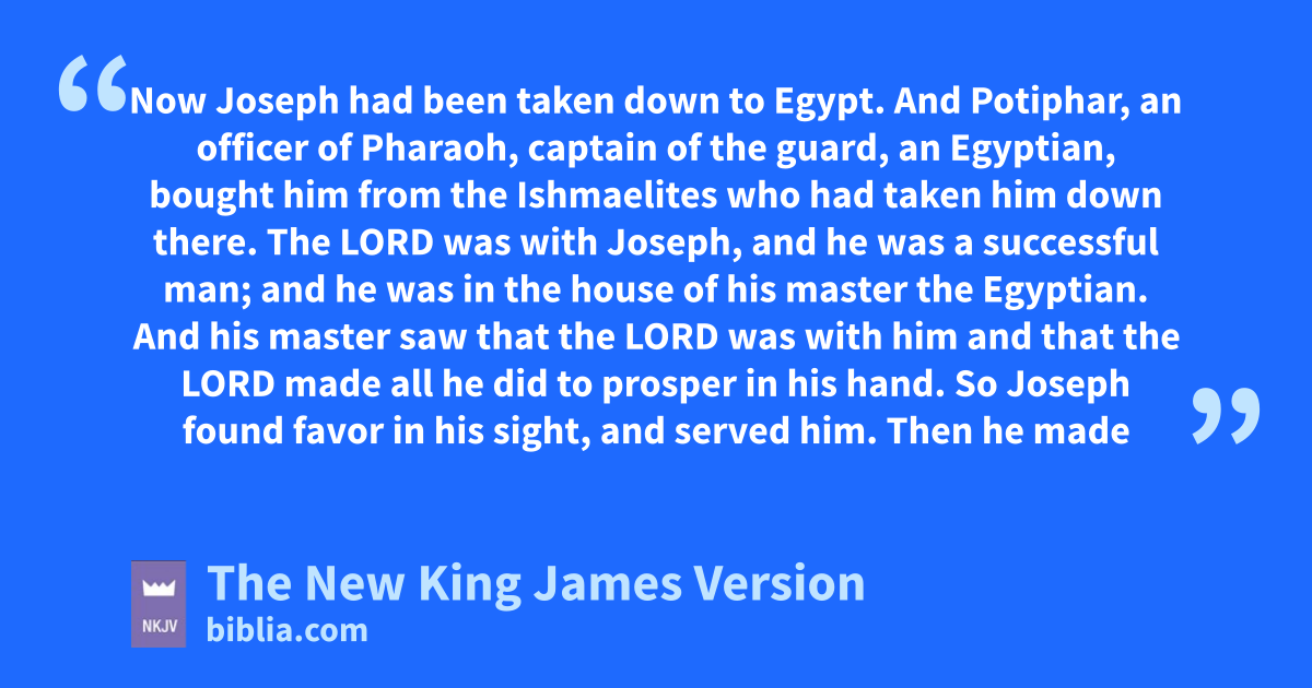 39 Now Joseph had been taken adown to Egypt. And bPotiphar, an officer of Pharaoh, captain of the guard, an Egyptian, cbought him from the Ishmaelites who had taken him down there. 2 dThe Lord was with Joseph, and he was a successful man; and he was in the house of his master the Egyptian. 3 And his master saw that the Lord was with him and that the Lord emade all he did 1to prosper in his hand. 4 So Joseph ffound favor in his sight, and served him. Then he made him goverseer of his house, and all that he had he put 2under his authority. 5 So it was, from the time that he had made him overseer of his house and all that he had, that hthe Lord blessed the Egyptian’s house for Joseph’s sake; and the blessing of the Lord was on all that he had in the house and in the field. 6 Thus he left all that he had in Joseph’s 3hand, and he did not know what he had except for the 4bread which he ate.