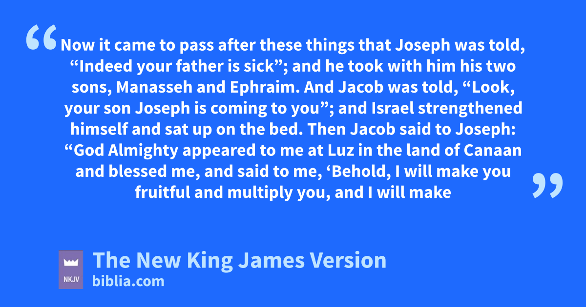 48 Now it came to pass after these things that Joseph was told, “Indeed your father is sick”; and he took with him his two sons, aManasseh and Ephraim. 2 And Jacob was told, “Look, your son Joseph is coming to you”; and Israel 1strengthened himself and sat up on the bed. 3 Then Jacob said to Joseph: “God bAlmighty appeared to me at cLuz in the land of Canaan and blessed me, 4 and said to me, ‘Behold, I will dmake you fruitful and multiply you, and I will make of you a multitude of people, and egive this land to your descendants after you fas an everlasting possession.’ 5 And now your gtwo sons, Ephraim and Manasseh, who were born to you in the land of Egypt before I came to you in Egypt, are mine; as Reuben and Simeon, they shall be mine. 6 Your 2offspring 3whom you beget after them shall be yours; they will be called by the name of their brothers in their inheritance. 7 But as for me, when I came from Padan, hRachel died beside me in the land of Canaan on the way, when there was but a little distance to go to Ephrath; and I buried her there on the way to Ephrath (that is, Bethlehem).”