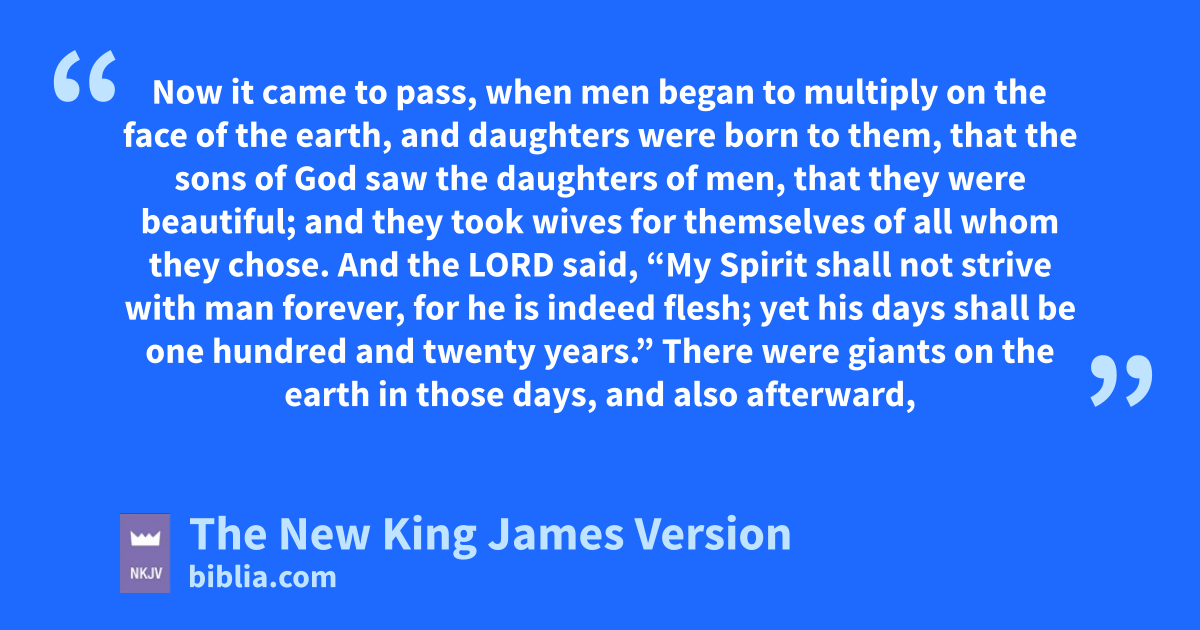 3 And the Lord said, c“My Spirit shall not dstrive 1with man forever, efor he is indeed flesh; yet his days shall be one hundred and twenty years.” 4 There were 2giants on the earth in those fdays, and also afterward, when the sons of God came in to the daughters of men and they bore children to them. Those were the mighty men who were of old, men of renown.