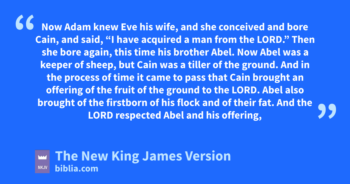 4 Now Adam knew Eve his wife, and she conceived and bore 1Cain, and said, “I have acquired a man from the Lord.” 2 Then she bore again, this time his brother 2Abel. Now aAbel was a keeper of sheep, but Cain was a tiller of the ground. 3 And 3in the process of time it came to pass that Cain brought an offering of the fruit bof the ground to the Lord. 4 Abel also brought of cthe firstborn of his flock and of dtheir fat. And the Lord erespected Abel and his offering, 5 but He did not respect Cain and his offering. And Cain was very angry, and his countenance fell.