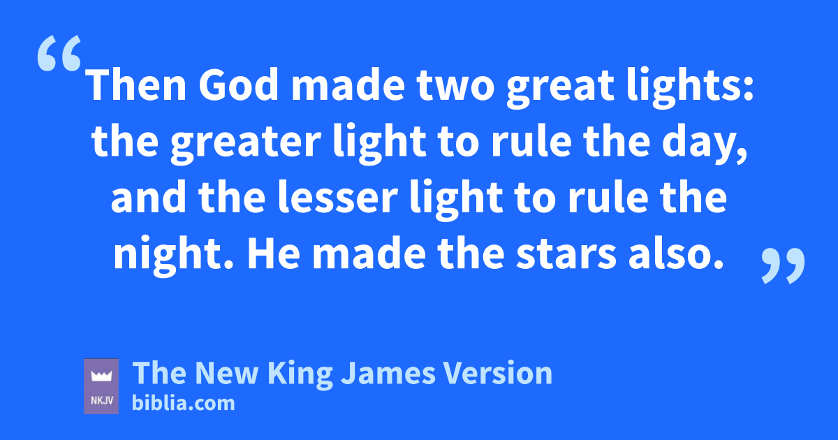 14 Then God said, “Let there be plights in the firmament of the heavens to divide the day from the night; and let them be for signs and qseasons, and for days and years; 15 and let them be for lights in the firmament of the heavens to give light on the earth”; and it was so. 16 Then God made two great 4lights: the rgreater light to rule the day, and the slesser light to rule the night. He made tthe stars also. 17 God set them in the firmament of the uheavens to give light on the earth, 18 and to vrule over the day and over the night, and to divide the light from the darkness. And God saw that it was good. 19 So the evening and the morning were the fourth day.