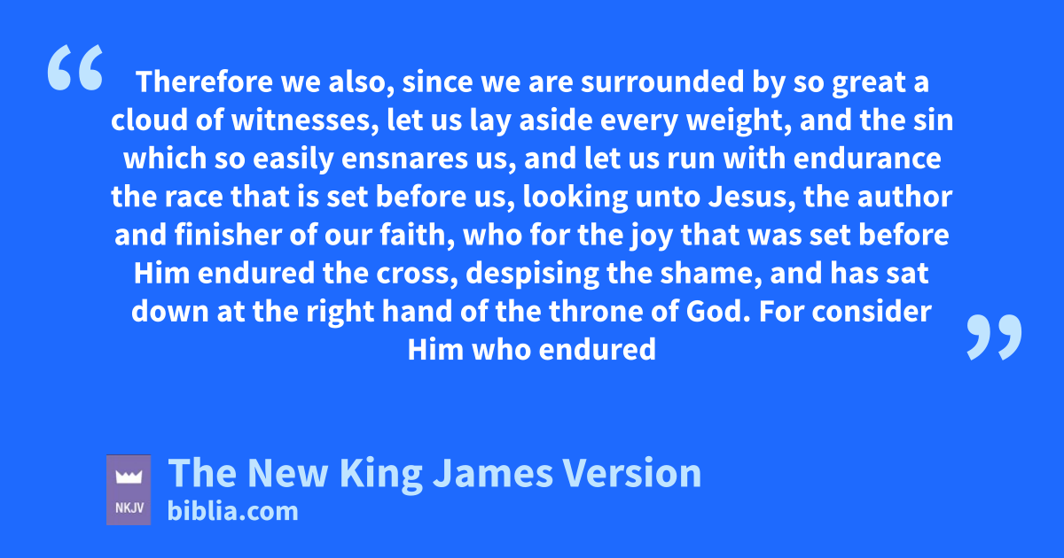12 Therefore we also, since we are surrounded by so great a cloud of witnesses, alet us lay aside every weight, and the sin which so easily ensnares us, and blet us run cwith endurance the race that is set before us, 2 looking unto Jesus, the 1author and 2finisher of our faith, dwho for the joy that was set before Him eendured the cross, despising the shame, and fhas sat down at the right hand of the throne of God.
