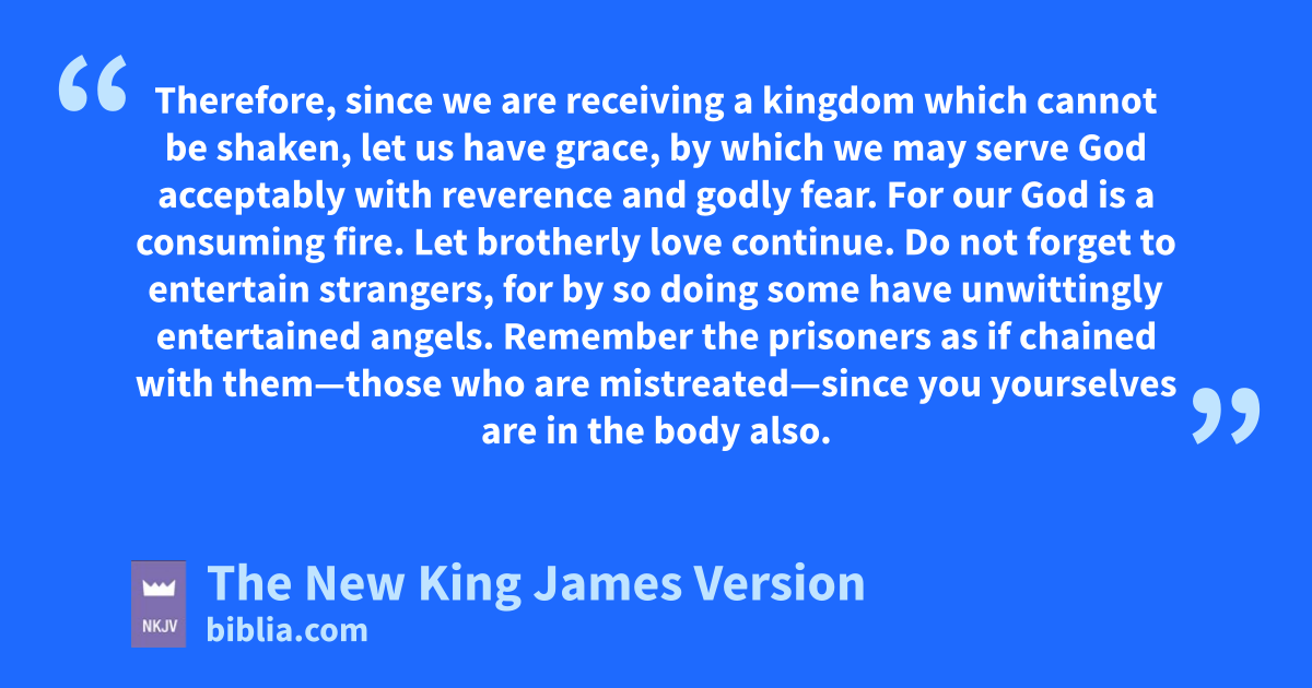 28 Therefore, since we are receiving a kingdom which cannot be shaken, let us have grace, by which we 3may nserve God acceptably with reverence and godly fear. 29 For oour God is a consuming fire.