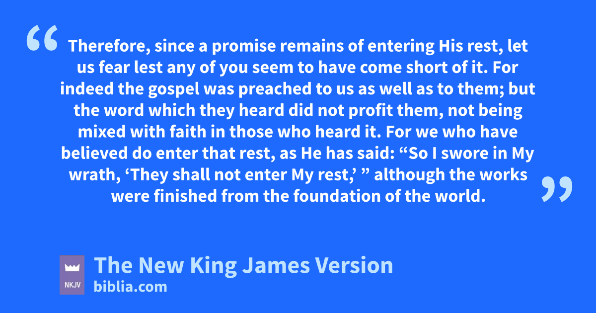 4 Therefore, since a promise remains of entering His rest, alet us fear lest any of you seem to have come short of it. 2 For indeed the gospel was preached to us as well as to them; but the word which they heard did not profit them, 1not being mixed with faith in those who heard it. 3 For we who have believed do enter that rest, as He has said:
