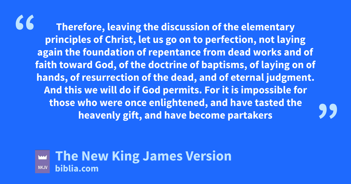 6 Therefore, aleaving the discussion of the elementary principles of Christ, let us go on to 1perfection, not laying again the foundation of repentance from bdead works and of faith toward God, 2 cof the doctrine of baptisms, dof laying on of hands, eof resurrection of the dead, fand of eternal judgment. 3 And this 2we will do if God permits.