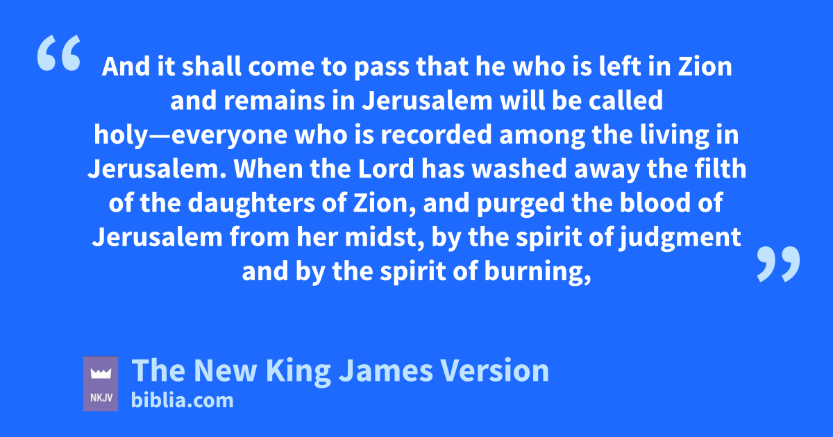 3 And it shall come to pass that he who is left in Zion and remains in Jerusalem ewill be called holy—everyone who is frecorded among the living in Jerusalem. 4 When gthe Lord has washed away the filth of the daughters of Zion, and purged the 1blood of Jerusalem from her midst, by the spirit of judgment and by the spirit of burning, 5 then the Lord will create above every dwelling place of Mount Zion, and above her assemblies, ha cloud and smoke by day and ithe shining of a flaming fire by night. For over all the glory there will be a 2covering. 6 And there will be a tabernacle for shade in the daytime from the heat, jfor a place of refuge, and for a shelter from storm and rain.