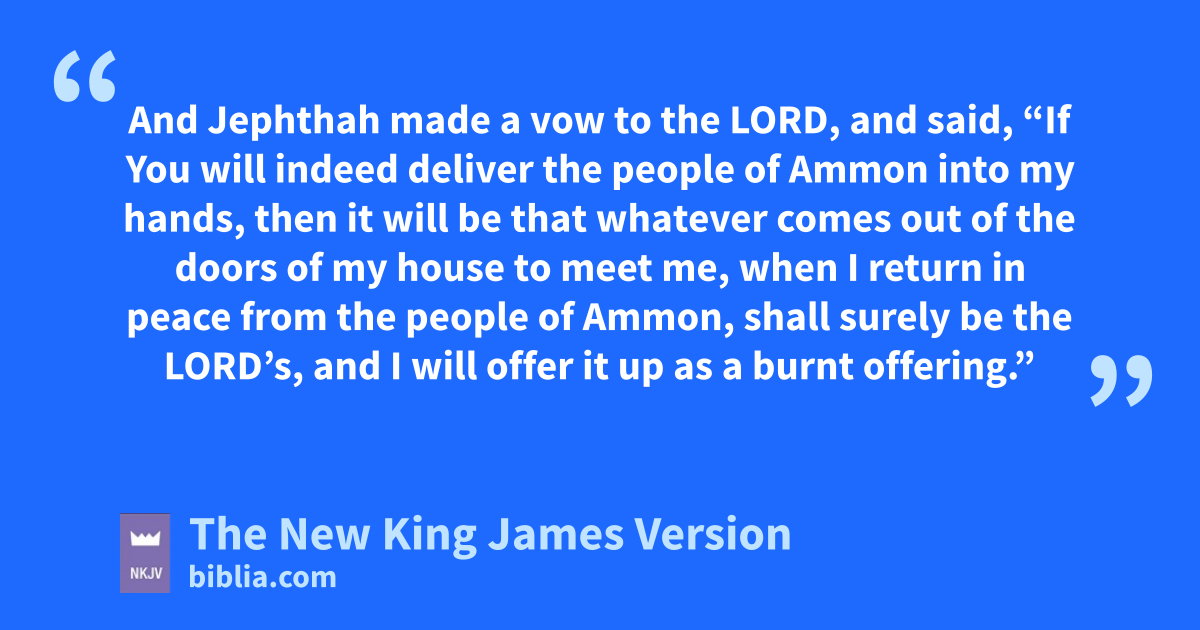 29 Then mthe Spirit of the Lord came upon Jephthah, and he passed through Gilead and Manasseh, and passed through Mizpah of Gilead; and from Mizpah of Gilead he advanced toward the people of Ammon. 30 And Jephthah nmade a vow to the Lord, and said, “If You will indeed deliver the people of Ammon into my hands, 31 then it will be that whatever comes out of the doors of my house to meet me, when I return in peace from the people of Ammon, oshall surely be the Lord’s, pand I will offer it up as a burnt offering.”