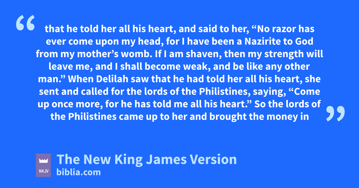 15 Then she said to him, f“How can you say, ‘I love you,’ when your heart is not with me? You have mocked me these three times, and have not told me where your great strength lies.” 16 And it came to pass, when she pestered him daily with her words and pressed him, so that his soul was 2vexed to death, 17 that he gtold her all his heart, and said to her, h“No razor has ever come upon my head, for I have been a Nazirite to God from my mother’s womb. If I am shaven, then my strength will leave me, and I shall become weak, and be like any other man.”