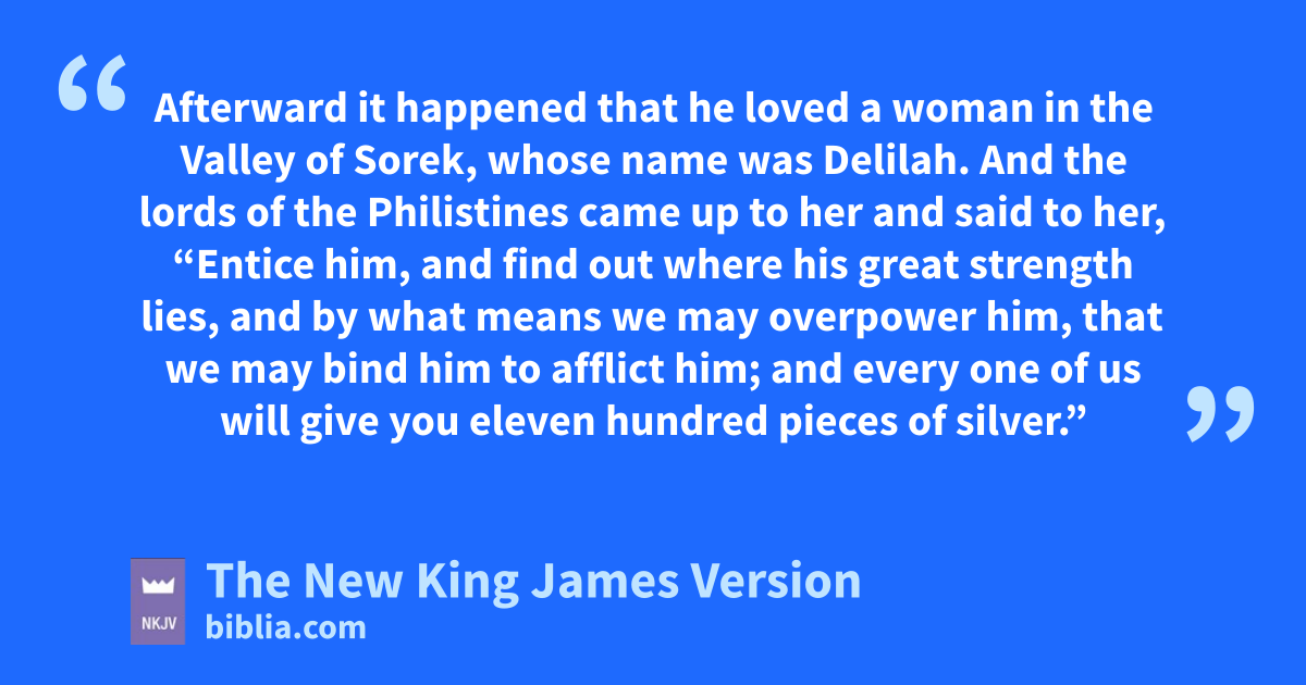 4 Afterward it happened that he loved a woman in the Valley of Sorek, whose name was Delilah. 5 And the clords of the Philistines came up to her and said to her, d“Entice him, and find out where his great strength lies, and by what means we may overpower him, that we may bind him to afflict him; and every one of us will give you eleven hundred pieces of silver.”