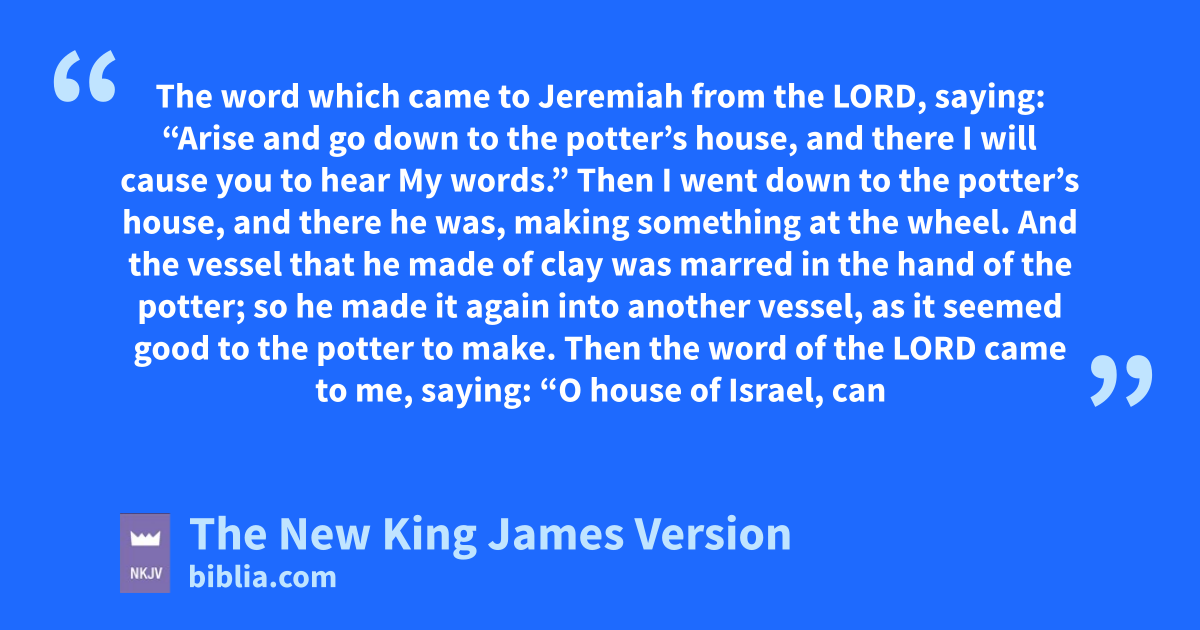 18 The word which came to Jeremiah from the Lord, saying: 2 “Arise and go down to the potter’s house, and there I will cause you to hear My words.” 3 Then I went down to the potter’s house, and there he was, making something at the 1wheel. 4 And the vessel that he 2made of clay was 3marred in the hand of the potter; so he made it again into another vessel, as it seemed good to the potter to make.