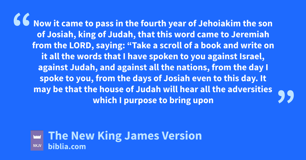 36 Now it came to pass in the afourth year of Jehoiakim the son of Josiah, king of Judah, that this word came to Jeremiah from the Lord, saying: 2 “Take a bscroll of a book and cwrite on it all the words that I have spoken to you against Israel, against Judah, and against dall the nations, from the day I spoke to you, from the days of eJosiah even to this day. 3 It fmay be that the house of Judah will hear all the adversities which I purpose to bring upon them, that everyone may gturn from his evil way, that I may forgive their iniquity and their sin.”