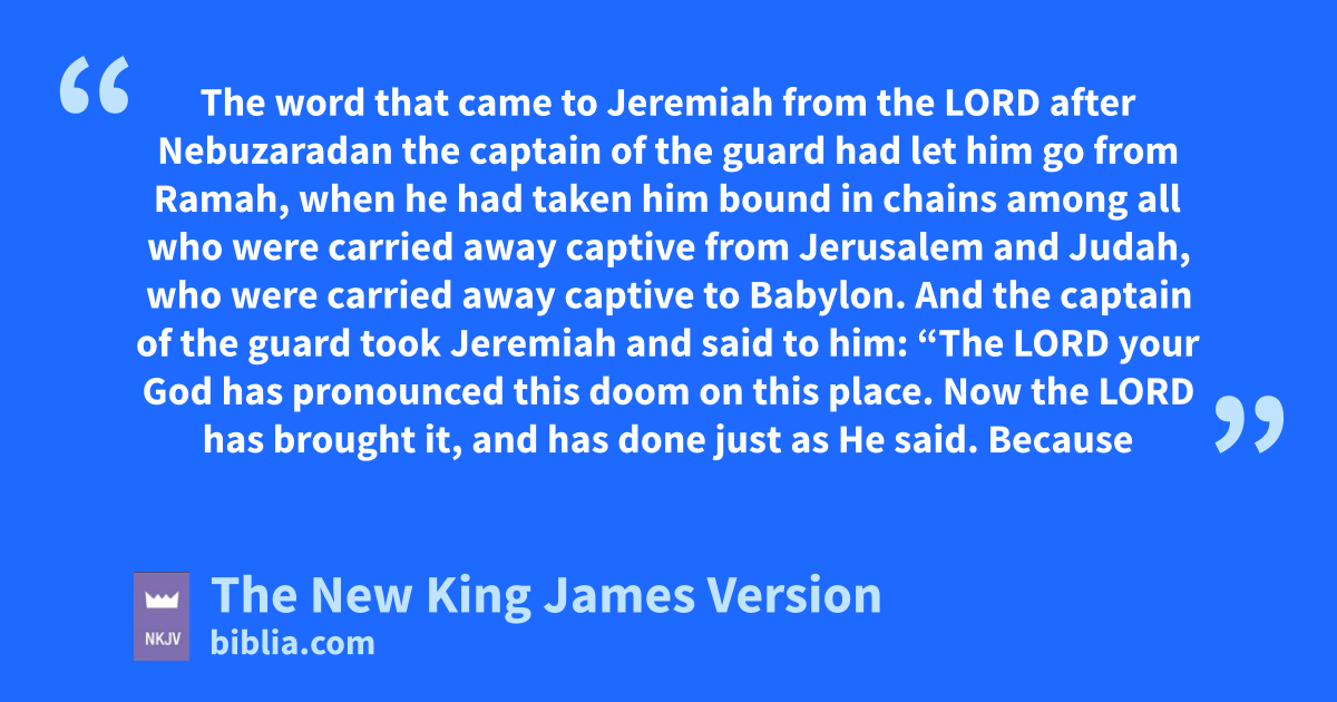 2 And the captain of the guard took Jeremiah and bsaid to him: “The Lord your God has pronounced this doom on this place. 3 Now the Lord has brought it, and has done just as He said. cBecause you people have sinned against the Lord, and not obeyed His voice, therefore this thing has come upon you. 4 And now look, I free you this day from the chains that 1were on your hand. dIf it seems good to you to come with me to Babylon, come, and I will look after you. But if it seems wrong for you to come with me to Babylon, remain here. See, eall the land is before you; wherever it seems good and convenient for you to go, go there.”
