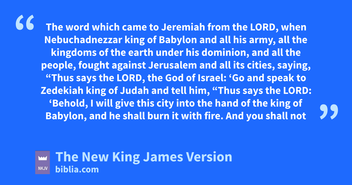 34 The word which came to Jeremiah from the Lord, awhen Nebuchadnezzar king of Babylon and all his army, ball the kingdoms of the earth under his dominion, and all the people, fought against Jerusalem and all its cities, saying, 2 “Thus says the Lord, the God of Israel: ‘Go and cspeak to Zedekiah king of Judah and tell him, “Thus says the Lord: ‘Behold, dI will give this city into the hand of the king of Babylon, and he shall burn it with fire. 3 And eyou shall not escape from his hand, but shall surely be taken and delivered into his hand; your eyes shall see the eyes of the king of Babylon, he shall speak with you fface 1to face, and you shall go to Babylon.’ ” ’ 4 Yet hear the word of the Lord, O Zedekiah king of Judah! Thus says the Lord concerning you: ‘You shall not die by the sword. 5 You shall die in peace; as in gthe ceremonies of your fathers, the former kings who were before you, hso they shall burn incense for you and ilament for you, saying, “Alas, lord!” For I have pronounced the word, says the Lord.’ ”