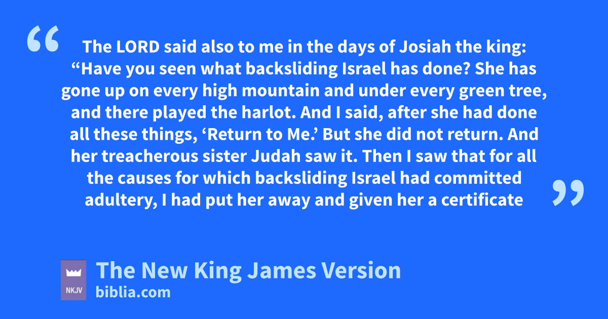 6 The Lord said also to me in the days of Josiah the king: “Have you seen what mbacksliding Israel has done? She has ngone up on every high mountain and under every green tree, and there played the harlot. 7 oAnd I said, after she had done all these things, ‘Return to Me.’ But she did not return. And her treacherous psister Judah saw it. 8 Then I saw that qfor all the causes for which backsliding Israel had committed adultery, I had rput her away and given her a certificate of divorce; syet her treacherous sister Judah did not fear, but went and played the harlot also. 9 So it came to pass, through her casual harlotry, that she tdefiled the land and committed adultery with ustones and trees. 10 And yet for all this her treacherous sister Judah has not turned to Me vwith her whole heart, but in pretense,” says the Lord.