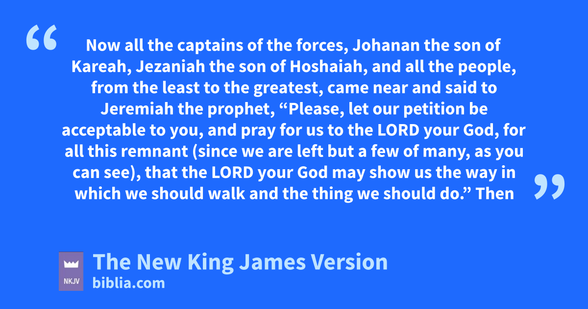 42 Now all the captains of the forces, aJohanan the son of Kareah, Jezaniah the son of Hoshaiah, and all the people, from the least to the greatest, came near 2 and said to Jeremiah the prophet, b“Please, let our petition be acceptable to you, and cpray for us to the Lord your God, for all this remnant (since we are left but da few of many, as you can see), 3 that the Lord your God may show us ethe way in which we should walk and the thing we should do.”