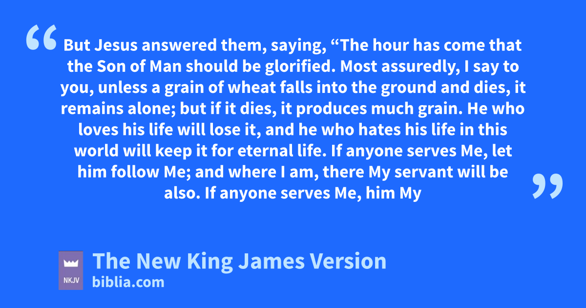 23 But Jesus answered them, saying, w“The hour has come that the Son of Man should be glorified. 24 Most assuredly, I say to you, xunless a grain of wheat falls into the ground and dies, it remains alone; but if it dies, it produces much 4grain. 25 yHe who loves his life will lose it, and he who hates his life in this world will keep it for eternal life. 26 If anyone serves Me, let him zfollow Me; and awhere I am, there My servant will be also. If anyone serves Me, him My Father will honor.