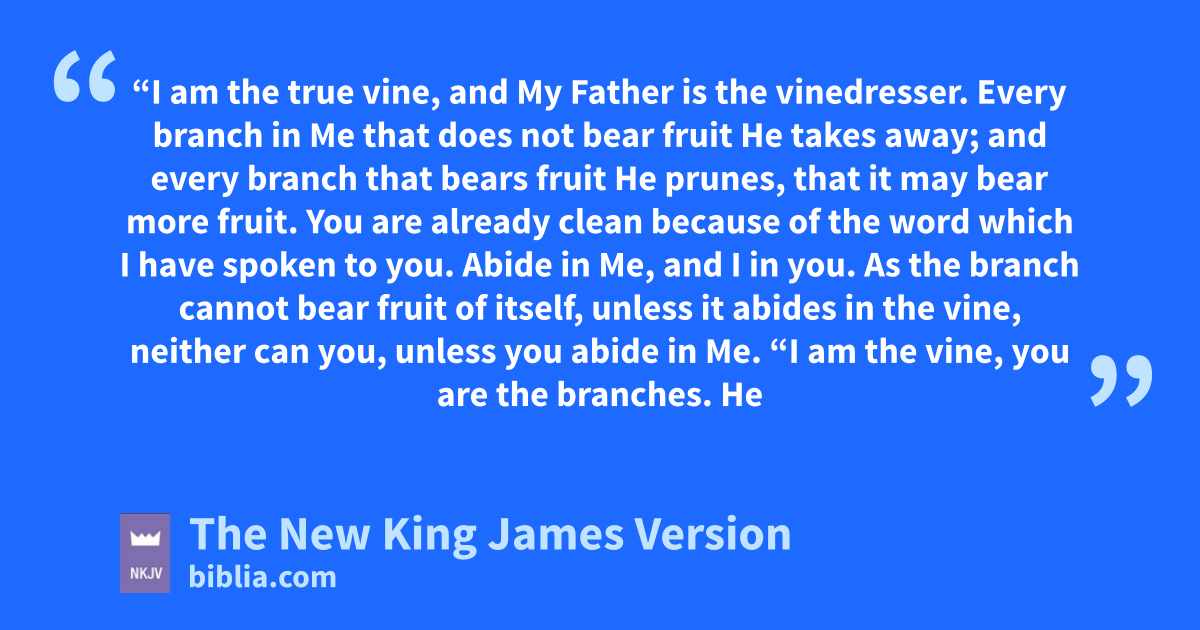15 “I am the true vine, and My Father is the vinedresser. 2 aEvery branch in Me that does not bear fruit He 1takes away; and every branch that bears fruit He prunes, that it may bear bmore fruit. 3 cYou are already clean because of the word which I have spoken to you. 4 dAbide in Me, and I in you. As the branch cannot bear fruit of itself, unless it abides in the vine, neither can you, unless you abide in Me.