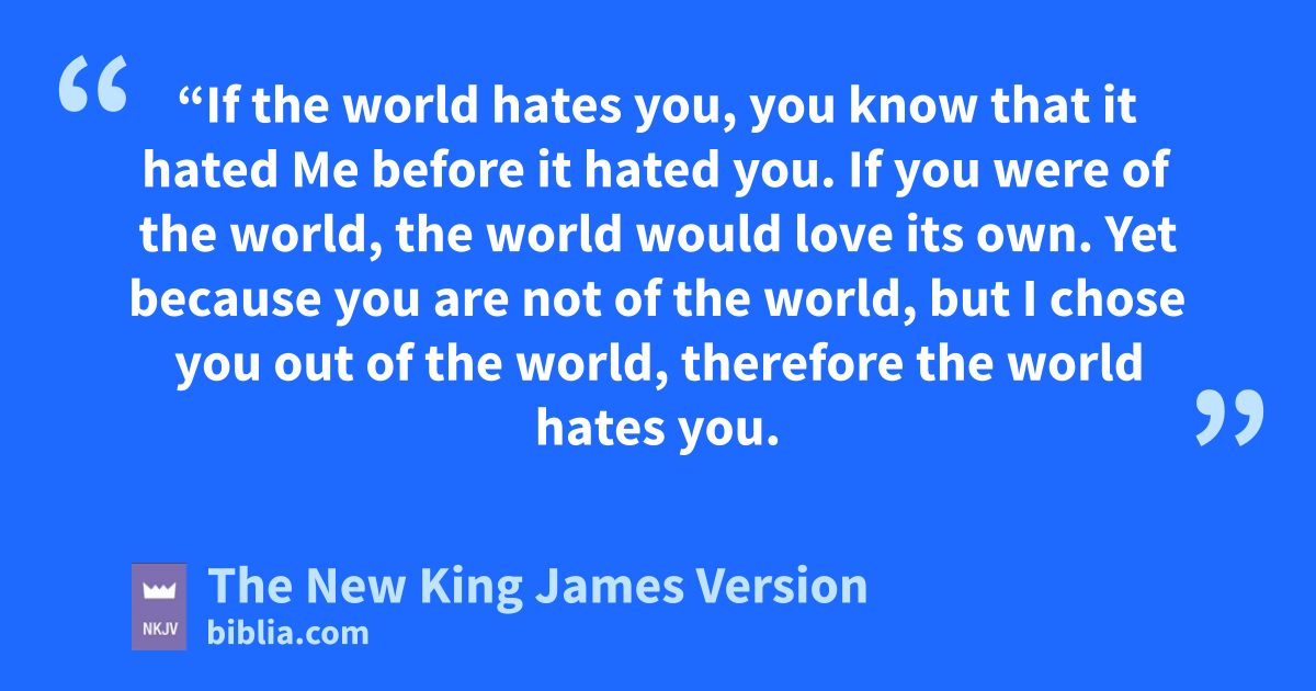 18 w“If the world hates you, you know that it hated Me before it hated you. 19 xIf you were of the world, the world would love its own. Yet ybecause you are not of the world, but I chose you out of the world, therefore the world hates you. 20 Remember the word that I said to you, z‘A servant is not greater than his master.’ If they persecuted Me, they will also persecute you. aIf they kept My word, they will keep yours also. 21 But ball these things they will do to you for My name’s sake, because they do not know Him who sent Me. 22 cIf I had not come and spoken to them, they would have no sin, dbut now they have no excuse for their sin. 23 eHe who hates Me hates My Father also. 24 If I had not done among them fthe works which no one else did, they would have no sin; but now they have gseen and also hated both Me and My Father. 25 But this happened that the word might be fulfilled which is written in their law, h‘They hated Me without a cause.’