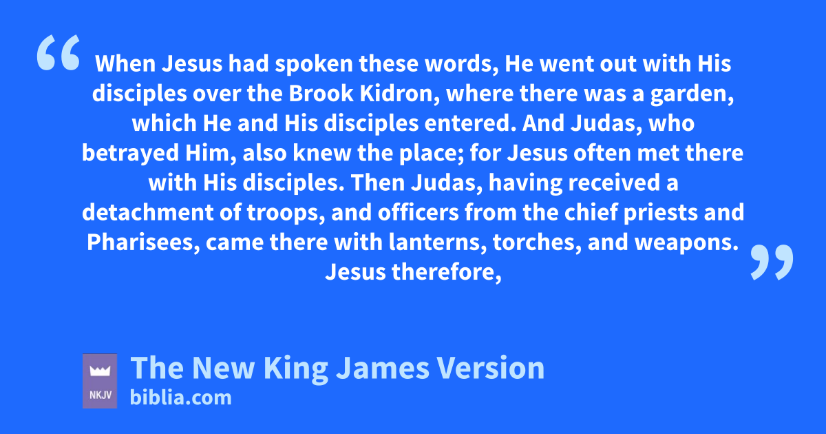 18 When Jesus had spoken these words, aHe went out with His disciples over bthe Brook Kidron, where there was a garden, which He and His disciples entered. 2 And Judas, who betrayed Him, also knew the place; cfor Jesus often met there with His disciples. 3 dThen Judas, having received a detachment of troops, and officers from the chief priests and Pharisees, came there with lanterns, torches, and weapons. 4 Jesus therefore, eknowing all things that would come upon Him, went forward and said to them, “Whom are you seeking?”