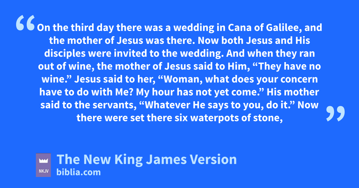 2 On the third day there was a awedding in bCana of Galilee, and the cmother of Jesus was there. 2 Now both Jesus and His disciples were invited to the wedding. 3 And when they ran out of wine, the mother of Jesus said to Him, “They have no wine.”