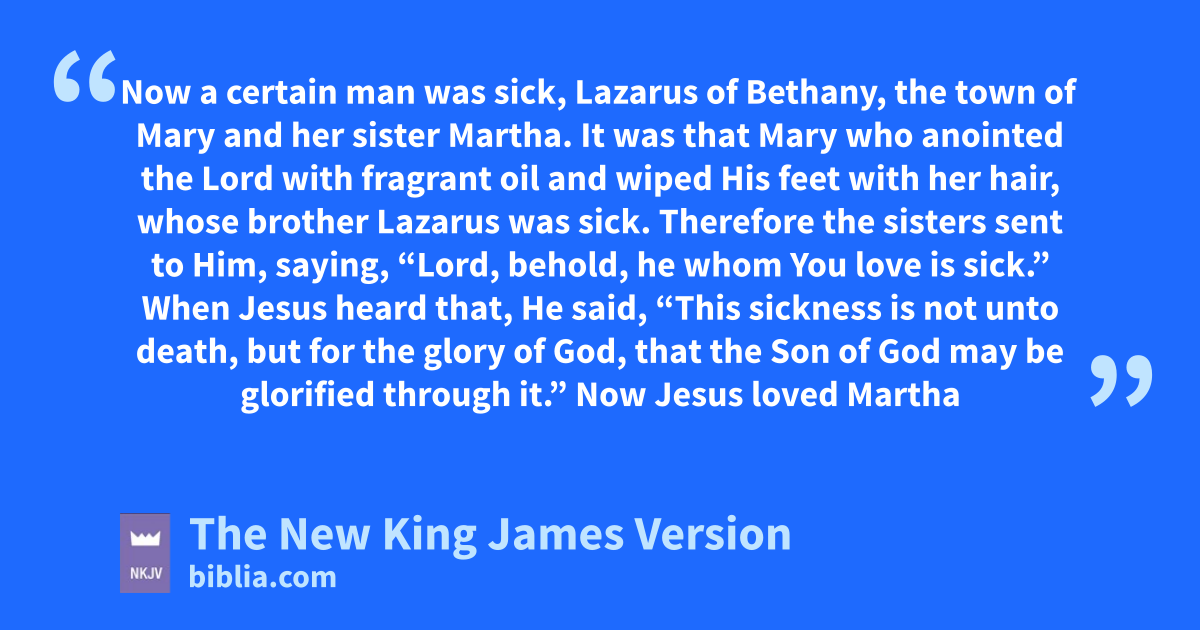 11 Now a certain man was sick, Lazarus of Bethany, the town of aMary and her sister Martha. 2 bIt was that Mary who anointed the Lord with fragrant oil and wiped His feet with her hair, whose brother Lazarus was sick. 3 Therefore the sisters sent to Him, saying, “Lord, behold, he whom You love is sick.”