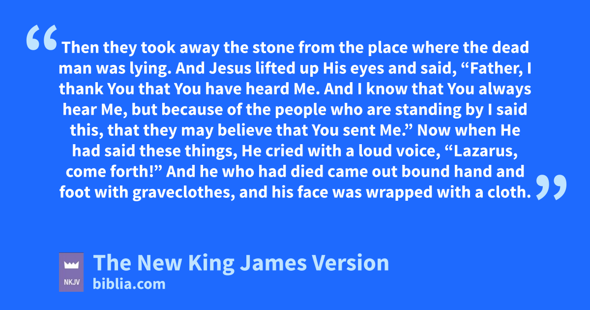 40 Jesus said to her, “Did I not say to you that if you would believe you would vsee the glory of God?” 41 Then they took away the stone 4from the place where the dead man was lying. And Jesus lifted up His eyes and said, “Father, I thank You that You have heard Me. 42 And I know that You always hear Me, but wbecause of the people who are standing by I said this, that they may believe that You sent Me.” 43 Now when He had said these things, He cried with a loud voice, “Lazarus, come forth!” 44 And he who had died came out bound hand and foot with xgraveclothes, and yhis face was wrapped with a cloth. Jesus said to them, “Loose him, and let him go.”