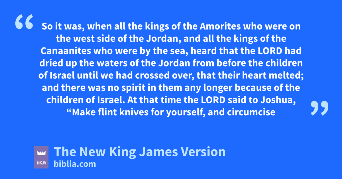 5 So it was, when all the kings of the Amorites who were on the west side of the Jordan, and all the kings of the Canaanites awho were by the sea, bheard that the Lord had dried up the waters of the Jordan from before the children of Israel until 1we had crossed over, that 2their heart melted; cand there was no spirit in them any longer because of the children of Israel.
