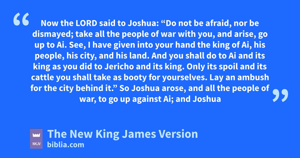 8 Now the Lord said to Joshua: a“Do not be afraid, nor be dismayed; take all the people of war with you, and arise, go up to Ai. See, bI have given into your hand the king of Ai, his people, his city, and his land. 2 And you shall do to Ai and its king as you did to cJericho and its king. Only dits spoil and its cattle you shall take as booty for yourselves. Lay an ambush for the city behind it.”