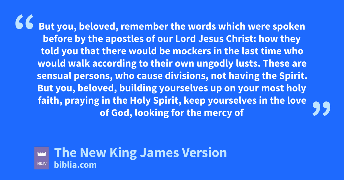 16 These are grumblers, complainers, walking according to their own lusts; and they tmouth great swelling words, uflattering people to gain advantage. 17 vBut you, beloved, remember the words which were spoken before by the apostles of our Lord Jesus Christ: 18 how they told you that wthere would be mockers in the last time who would walk according to their own ungodly lusts. 19 These are 9sensual persons, who cause divisions, not having the Spirit.