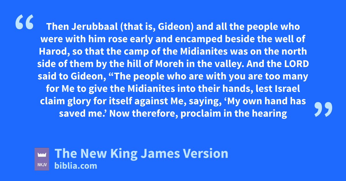 2 And the Lord said to Gideon, “The people who are with you are too many for Me to give the Midianites into their hands, lest Israel bclaim glory for itself against Me, saying, ‘My own hand has saved me.’ 3 Now therefore, proclaim in the hearing of the people, saying, c‘Whoever is fearful and afraid, let him turn and depart at once from Mount Gilead.’ ” And twenty-two thousand of the people returned, and ten thousand remained.