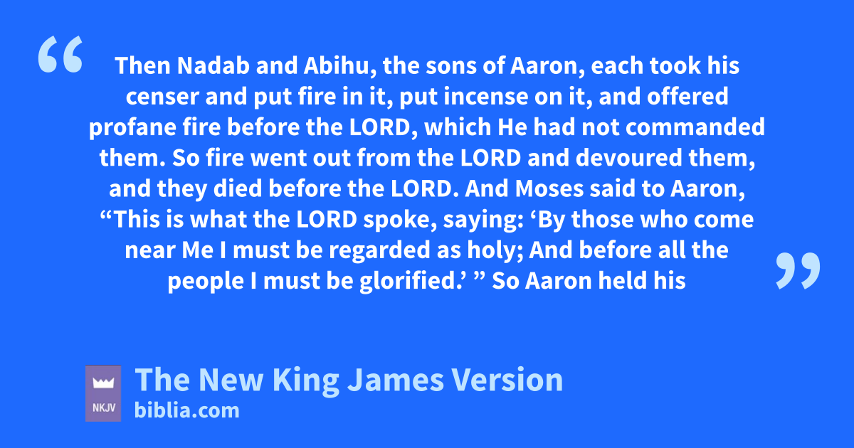 10 Then Nadab aand Abihu, the sons of Aaron, beach took his censer and put fire in it, put incense on it, and offered cprofane fire before the Lord, which He had not commanded them. 2 So dfire went out from the Lord and devoured them, and they died before the Lord. 3 And Moses said to Aaron, “This is what the Lord spoke, saying: