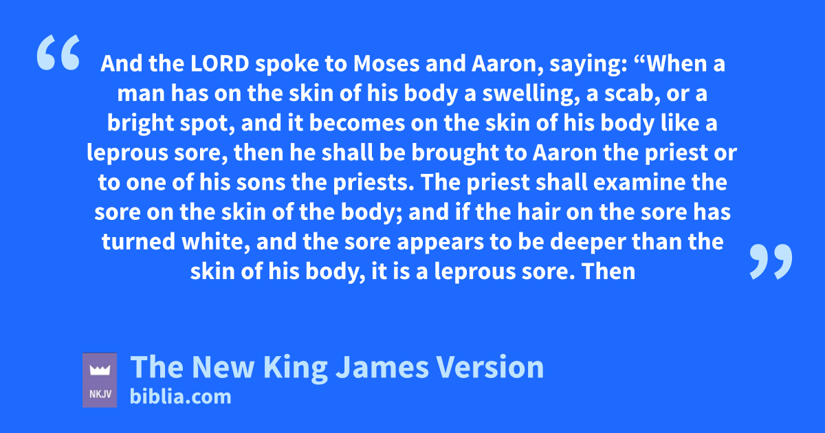 13 And the Lord spoke to Moses and Aaron, saying: 2 “When a man has on the skin of his body a swelling, aa scab, or a bright spot, and it becomes on the skin of his body like a 1leprous sore, bthen he shall be brought to Aaron the priest or to one of his sons the priests. 3 The priest shall examine the sore on the skin of the body; and if the hair on the sore has turned white, and the sore appears to be deeper than the skin of his body, it is a leprous sore. Then the priest shall examine him, and pronounce him 2unclean. 4 But if the bright spot is white on the skin of his body, and does not appear to be deeper than the skin, and its hair has not turned white, then the priest shall isolate the one who has the sore cseven days. 5 And the priest shall examine him on the seventh day; and indeed if the sore appears to be as it was, and the sore has not spread on the skin, then the priest shall isolate him another seven days. 6 Then the priest shall examine him again on the seventh day; and indeed if the sore has faded, and the sore has not spread on the skin, then the priest shall pronounce him clean; it is only a scab, and he dshall wash his clothes and be clean. 7 But if the scab should at all spread over the skin, after he has been seen by the priest for his cleansing, he shall be seen by the priest again. 8 And if the priest sees that the scab has indeed spread on the skin, then the priest shall pronounce him 3unclean. It is leprosy.
