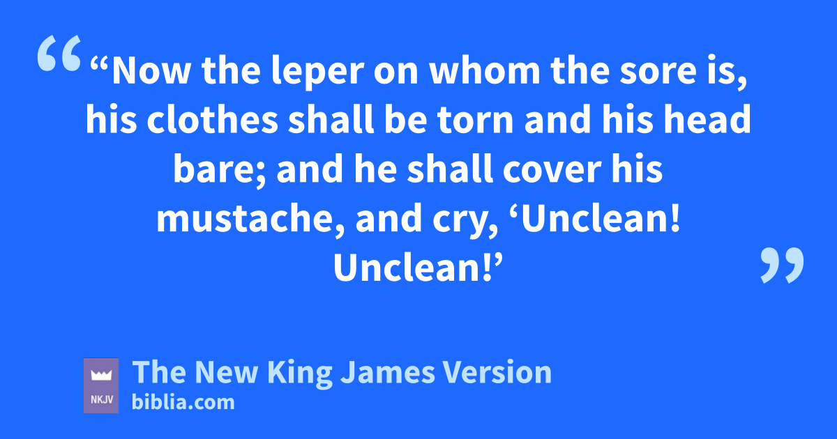 45 “Now the leper on whom the sore is, his clothes shall be torn and his head kbare; and he shall lcover his mustache, and cry, m‘Unclean! Unclean!’ 46 He shall be unclean. All the days he has the sore he shall be unclean. He is unclean, and he shall 7dwell alone; his dwelling shall be noutside the camp.