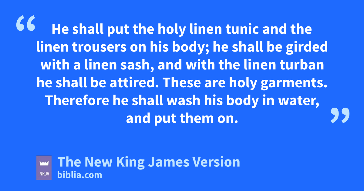 3 1“Thus Aaron shall dcome into the Holy Place: ewith the blood of a young bull as a sin offering, and of a ram as a burnt offering. 4 He shall put the fholy linen tunic and the linen trousers on his body; he shall be girded with a linen sash, and with the linen turban he shall be attired. These are holy garments. Therefore ghe shall wash his body in water, and put them on. 5 And he shall take from hthe congregation of the children of Israel two kids of the goats as a sin offering, and one ram as a burnt offering.