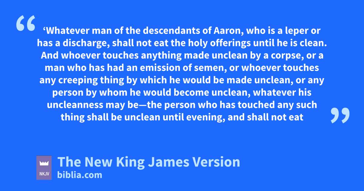 4 ‘Whatever man of the descendants of Aaron, who is a eleper or has fa discharge, shall not eat the holy offerings guntil he is clean. And hwhoever touches anything made unclean by a corpse, or ia man who has had an emission of semen, 5 or jwhoever touches any creeping thing by which he would be made unclean, or kany person by whom he would become unclean, whatever his uncleanness may be—6 the person who has touched any such thing shall be unclean until evening, and shall not eat the holy offerings unless he lwashes his body with water. 7 And when the sun goes down he shall be clean; and afterward he may eat the holy offerings, because mit is his food. 8 nWhatever dies naturally or is torn by beasts he shall not eat, to defile himself with it: I am the Lord.