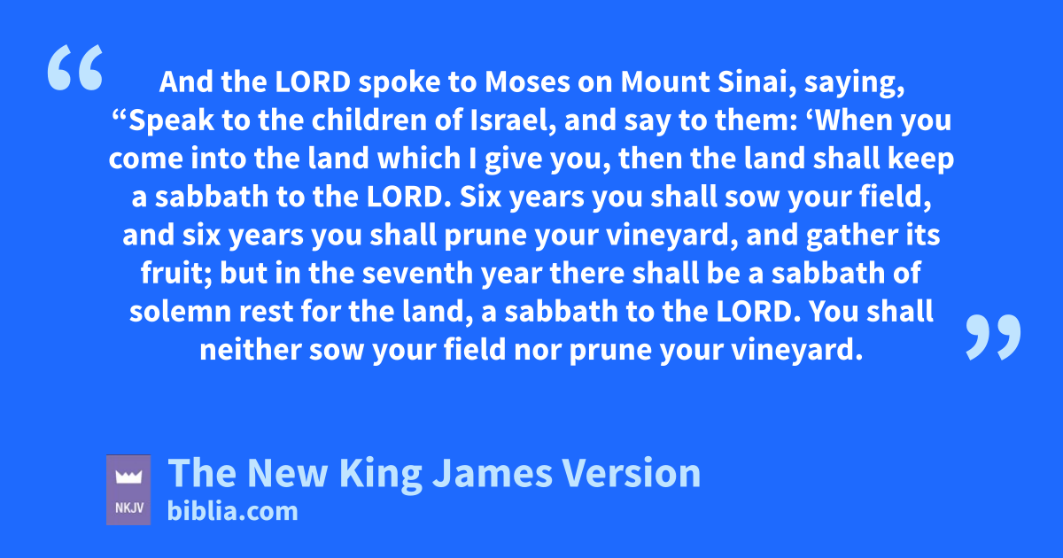 25 And the Lord spoke to Moses on Mount aSinai, saying, 2 “Speak to the children of Israel, and say to them: ‘When you come into the land which I give you, then the land shall bkeep a sabbath to the Lord. 3 Six years you shall sow your field, and six years you shall prune your vineyard, and gather its fruit; 4 but in the cseventh year there shall be a sabbath of solemn drest for the land, a sabbath to the Lord. You shall neither sow your field nor prune your vineyard. 5 eWhat grows of its own accord of your harvest you shall not reap, nor gather the grapes of your untended vine, for it is a year of rest for the land. 6 And the sabbath produce of the land shall be food for you: for you, your male and female servants, your hired man, and the stranger who dwells with you, 7 for your livestock and the beasts that are in your land—all its produce shall be for food.