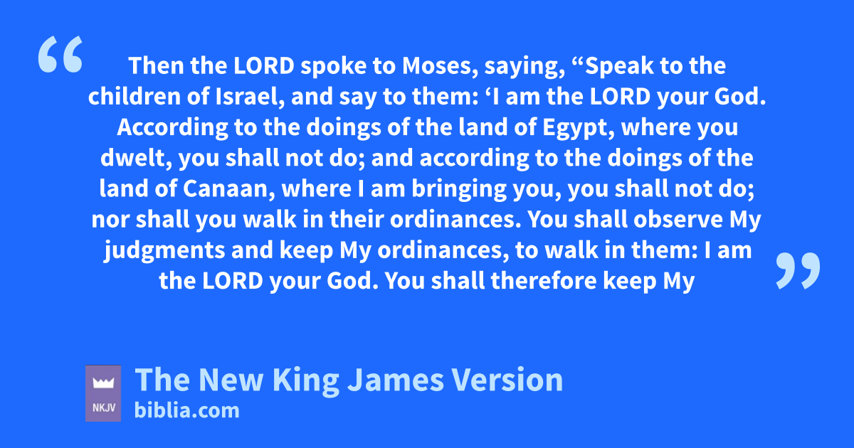 18 Then the Lord spoke to Moses, saying, 2 “Speak to the children of Israel, and say to them: a‘I am the Lord your God. 3 bAccording to 1the doings of the land of Egypt, where you dwelt, you shall not do; and caccording to the doings of the land of Canaan, where I am bringing you, you shall not do; nor shall you walk in their 2ordinances. 4 dYou shall observe My judgments and keep My ordinances, to walk in them: I am the Lord your God. 5 You shall therefore keep My statutes and My judgments, which if a man does, he shall live by them: I am the Lord.