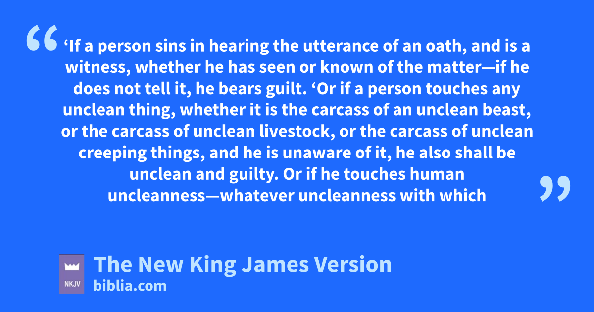 2 ‘Or cif a person touches any unclean thing, whether it is the carcass of an unclean beast, or the carcass of unclean livestock, or the carcass of unclean creeping things, and he is unaware of it, he also shall be unclean and dguilty. 3 Or if he touches ehuman uncleanness—whatever uncleanness with which a man may be defiled, and he is unaware of it—when he realizes it, then he shall be guilty.