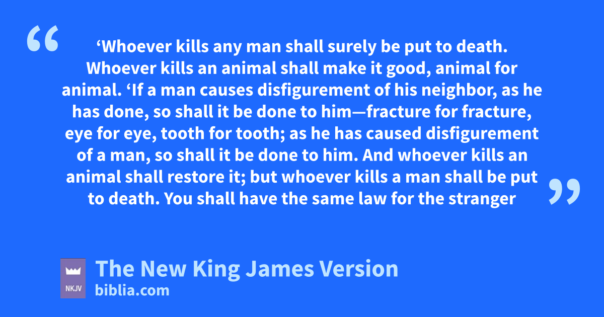19 ‘If a man causes disfigurement of his neighbor, as she has done, so shall it be done to him—20 fracture for tfracture, ueye for eye, tooth for tooth; as he has caused disfigurement of a man, so shall it be done to him. 21 And whoever kills an animal shall restore it; but whoever kills a man shall be put to death. 22 You shall have vthe 5same law for the stranger and for one from your own country; for I am the Lord your God.’ ”