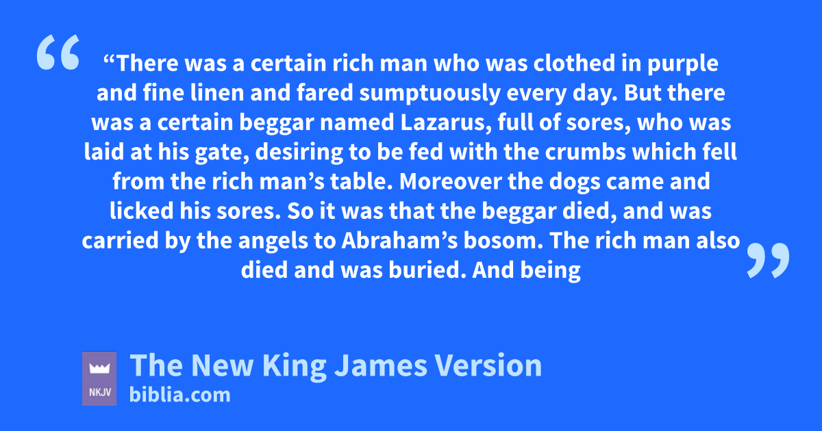 19 “There was a certain rich man who was clothed in purple and fine linen and 8fared sumptuously every day. 20 But there was a certain beggar named Lazarus, full of sores, who was laid at his gate, 21 desiring to be fed with 9the crumbs which fell from the rich man’s table. Moreover the dogs came and licked his sores. 22 So it was that the beggar died, and was carried by the angels to oAbraham’s bosom. The rich man also died and was buried. 23 And being in torments in Hades, he lifted up his eyes and saw Abraham afar off, and Lazarus in his bosom.