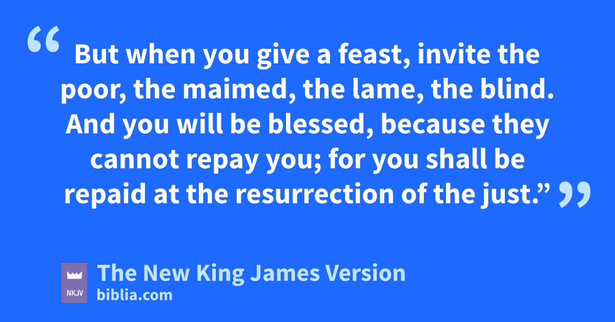 12 Then He also said to him who invited Him, “When you give a dinner or a supper, do not ask your friends, your brothers, your relatives, nor rich neighbors, lest they also invite you back, and you be repaid. 13 But when you give a feast, invite ethe poor, the 4maimed, the lame, the blind. 14 And you will be fblessed, because they cannot repay you; for you shall be repaid at the resurrection of the just.”