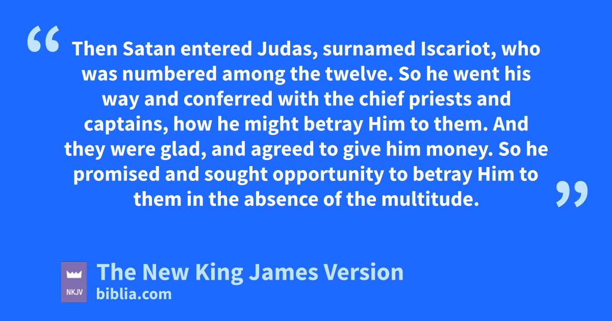 3 cThen Satan entered Judas, surnamed Iscariot, who was numbered among the dtwelve. 4 So he went his way and conferred with the chief priests and captains, how he might betray Him to them. 5 And they were glad, and eagreed to give him money. 6 So he promised and sought opportunity to fbetray Him to them in the absence of the multitude.