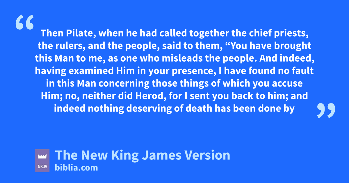 13 pThen Pilate, when he had called together the chief priests, the rulers, and the people, 14 said to them, q“You have brought this Man to me, as one who misleads the people. And indeed, rhaving examined Him in your presence, I have found no fault in this Man concerning those things of which you accuse Him; 15 no, neither did Herod, for 4I sent you back to him; and indeed nothing deserving of death has been done by Him. 16 sI will therefore chastise Him and release Him” 17 t(for 5it was necessary for him to release one to them at the feast).