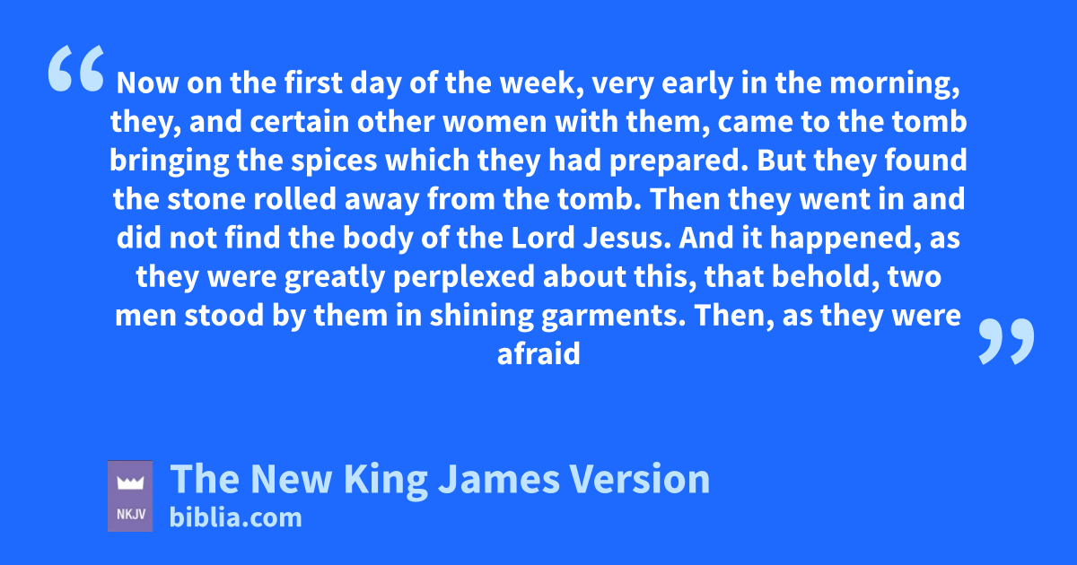 24 Now aon the first day of the week, very early in the morning, they, 1and certain other women with them, came to the tomb bbringing the spices which they had prepared. 2 cBut they found the stone rolled away from the tomb. 3 dThen they went in and did not find the body of the Lord Jesus. 4 And it happened, as they were 2greatly perplexed about this, that ebehold, two men stood by them in shining garments. 5 Then, as they were afraid and bowed their faces to the earth, they said to them, “Why do you seek the living among the dead? 6 He is not here, but is risen! fRemember how He spoke to you when He was still in Galilee, 7 saying, ‘The Son of Man must be gdelivered into the hands of sinful men, and be crucified, and the third day rise again.’ ”