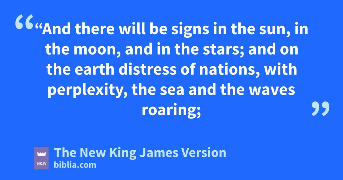 25 a“And there will be signs in the sun, in the moon, and in the stars; and on the earth distress of nations, with perplexity, the sea and the waves roaring; 26 men’s hearts failing them from fear and the expectation of those things which are coming on the earth, bfor the powers of the heavens will be shaken. 27 Then they will see the Son of Man ccoming in a cloud with power and great glory. 28 Now when these things begin to happen, look up and lift up your heads, because dyour redemption draws near.”