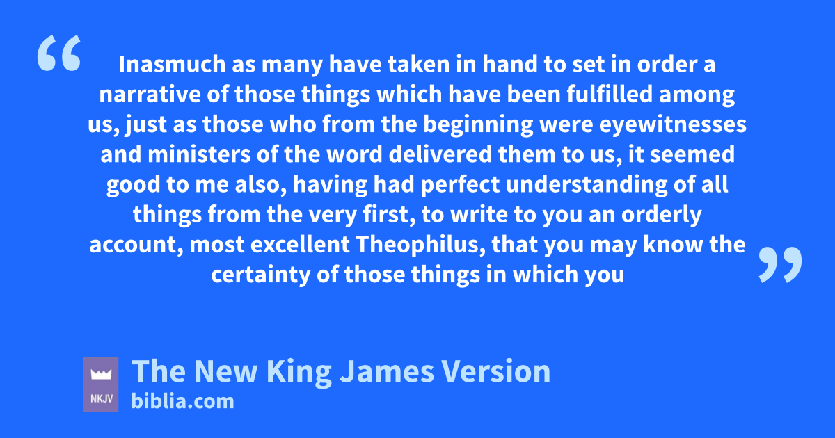 1 Inasmuch as many have taken in hand to set in order a narrative of those athings which 1have been fulfilled among us, 2 just as those who bfrom the beginning were ceyewitnesses and ministers of the word ddelivered them to us, 3 it seemed good to me also, having 2had perfect understanding of all things from the very first, to write to you an orderly account, emost excellent Theophilus, 4 fthat you may know the certainty of those things in which you were instructed.