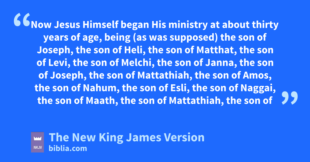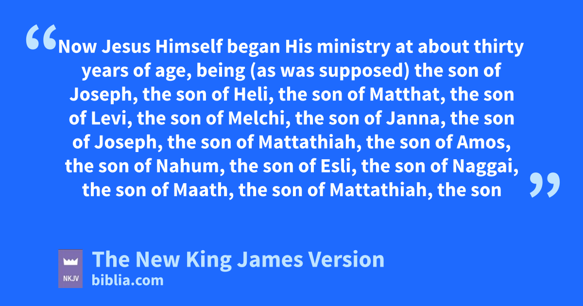 23 Now Jesus Himself began His ministry at wabout thirty years of age, being (as was supposed) xthe son of Joseph, the son of Heli, 24 the son of Matthat, the son of Levi, the son of Melchi, the son of Janna, the son of Joseph, 25 the son of Mattathiah, the son of Amos, the son of Nahum, the son of Esli, the son of Naggai, 26 the son of Maath, the son of Mattathiah, the son of Semei, the son of Joseph, the son of Judah, 27 the son of Joannas, the son of Rhesa, the son of yZerubbabel, the son of Shealtiel, the son of Neri, 28 the son of Melchi, the son of Addi, the son of Cosam, the son of Elmodam, the son of Er, 29 the son of Jose, the son of Eliezer, the son of Jorim, the son of Matthat, the son of Levi, 30 the son of Simeon, the son of Judah, the son of Joseph, the son of Jonan, the son of Eliakim, 31 the son of Melea, the son of Menan, the son of Mattathah, the son of zNathan, athe son of David, 32 bthe son of Jesse, the son of Obed, the son of Boaz, the son of Salmon, the son of Nahshon, 33 the son of Amminadab, the son of Ram, the son of Hezron, the son of Perez, the son of Judah, 34 the son of Jacob, the son of Isaac, the son of Abraham, cthe son of Terah, the son of Nahor, 35 the son of Serug, the son of Reu, the son of Peleg, the son of Eber, the son of Shelah, 36 dthe son of Cainan, the son of eArphaxad, fthe son of Shem, the son of Noah, the son of Lamech, 37 the son of Methuselah, the son of Enoch, the son of Jared, the son of Mahalalel, the son of Cainan, 38 the son of Enosh, the son of Seth, the son of Adam, gthe son of God.